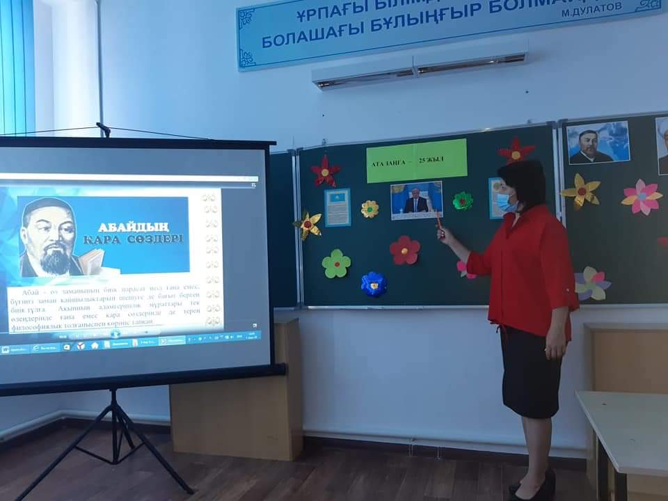 "Қарасу негізгі орта мектебі, мектепке дейінгі шағын орталығымен" коммуналдық мемлекеттік мекемесінде 1- қыркүйек Білім күніне арналған Қ.Р.Конституциясының 25 жылдығы, Әл-Фарабидің 1150 жылдығы, А.Құнанбаевтың 175 жылдығына арналған мерекелік даталарын құрайтын бірыңғай сынып сағаттары өткізілді.