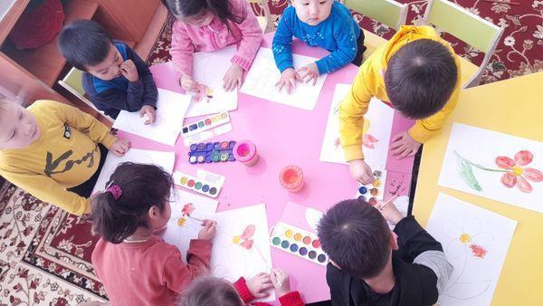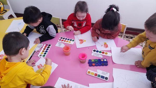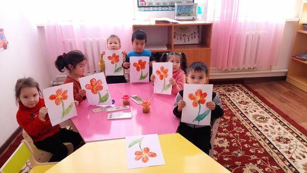 "Қарасу негізгі орта мектебі, мектепке дейінгі шағын орталығымен" коммуналдық мемлекеттік мекемесіндегі шағын орталық тәрбиеленушілері акварелдің көмегімен гүлді бояу көрінісі.Тәрбиеші- Атманова Айнұр Батырхановна