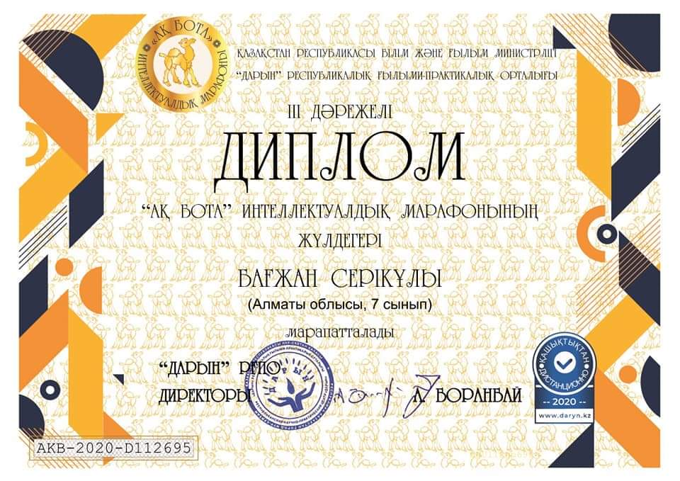 04 декабрь 2020 0 1 2 3 4 5 "АҚ БОТА" интеллектуалдық марафонының жүлдегерлері Қазақстан Республикасы білім және ғылым министрлігі. "Дарын" республикалық ғылыми практикалық орталығы. II-ІІІ дәрежелі Диплом "АҚ БОТА" интеллектуалдық марафонының жүлдегерлері
