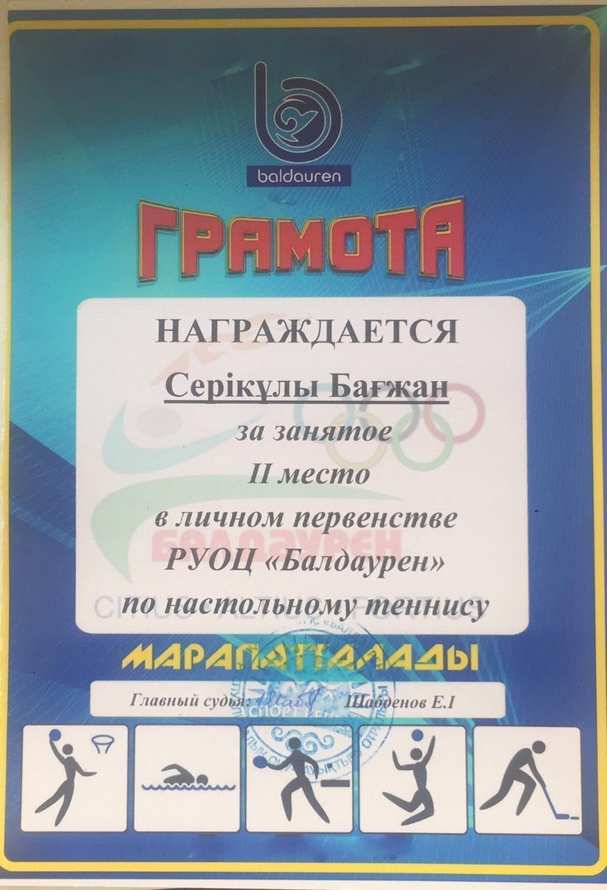 "Қарасу негізгі орта мектебі, мектепке дейінгі шағын орталығымен" коммуналдық мемлекеттік мекемесінің 8-сынып оқушысы Серікұлы Бағжан Қапшағай қаласындағы Балдәурен - Қапшағай Республикалық оқу сауықтыру орталығына наурыз айында демалып қайтты. Демалыс лагерінде теннис үйірмесіне белсенді қатысып, сертификат алды.Сонымен қатар теннис спортық сайысында 2 орын иеленді
