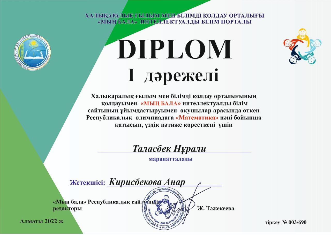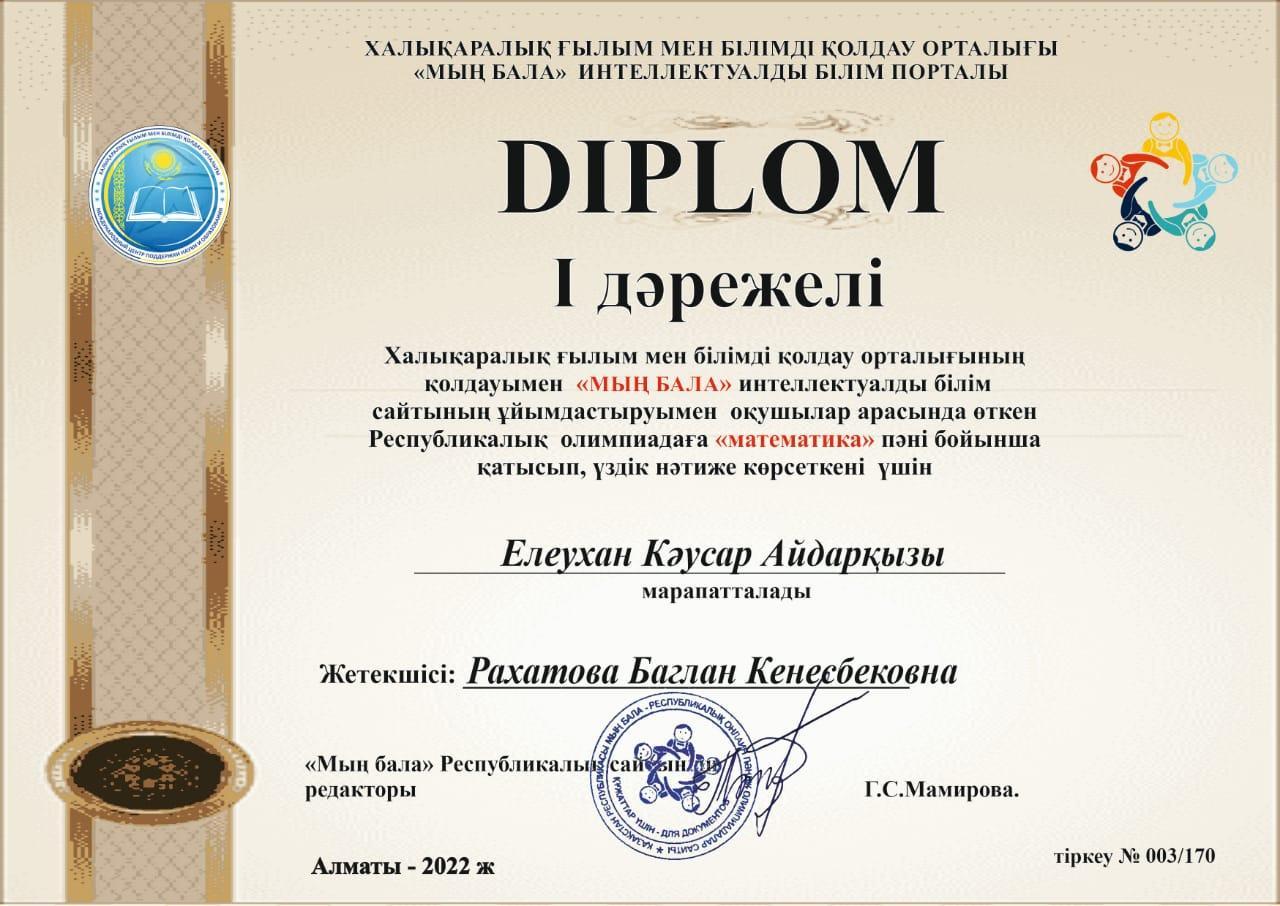 "Қарасу негізгі орта мектебі, мектепке дейінгі шағын орталығымен" коммуналдық мемлекеттік мекемесінің 5 сынып оқушысы Елеухан Кәусар және 2 сынып оқушысы Таласбек Нұрали Халықаралық ғылым мен білімді қолдау орталығының қолдауымен "Мың бала" интеллектуалды білім сайтының ұйымдастыруымен оқушылар арасында өткен Республикалық олимпиадаға "математика" пәні бойынша қатысып, 1 дәрежелі диплом иегерлері атанды.