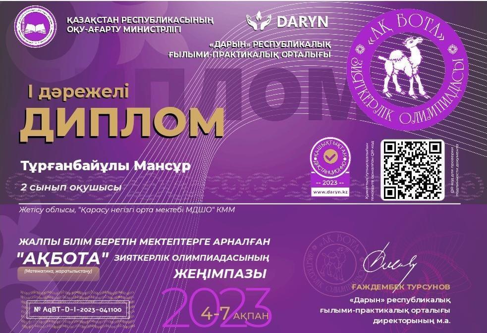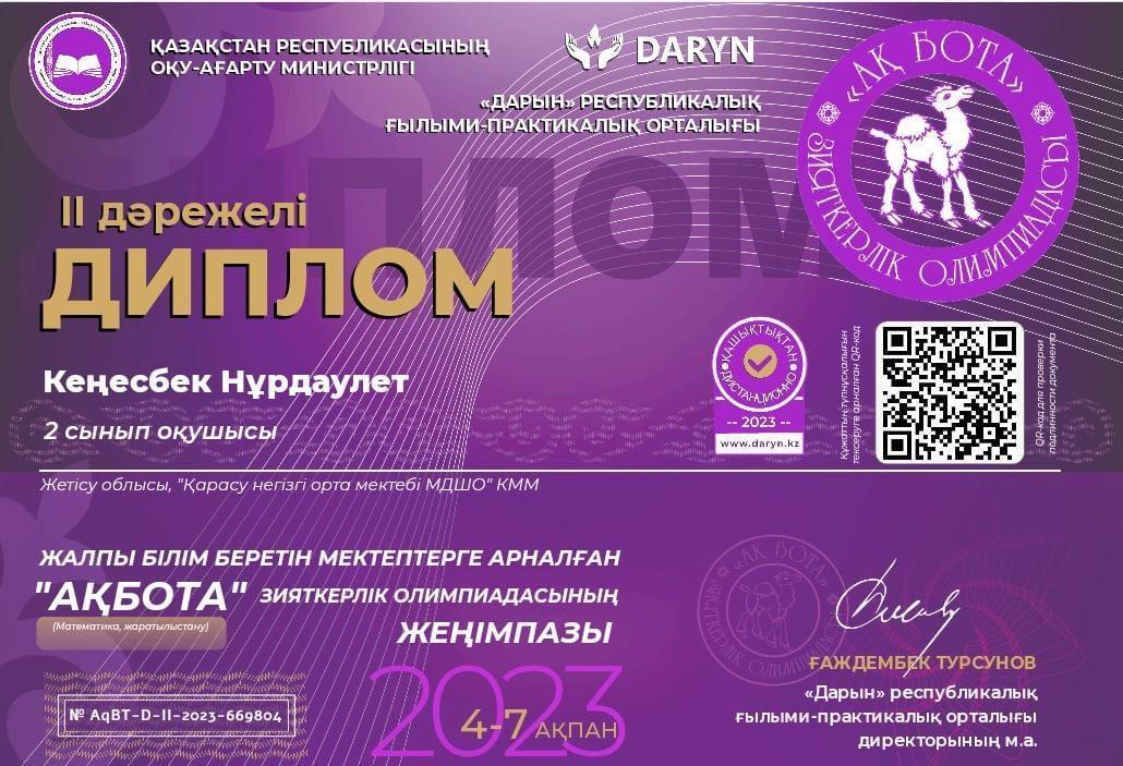 Жетісу облысы, Ақсу ауданы, "Қарасу негізгі орта мектебі, мектепке дейінгі шағын орталығымен" коммуналдық мемлекеттік мекемесіМектебіміздің білімді оқушылары Республикалық "ДАРЫН" ғылыми - практикалық орталығы ұйымдастырған"Ақбота" зияткерлік олимдасының жүлдегерлері атанды.