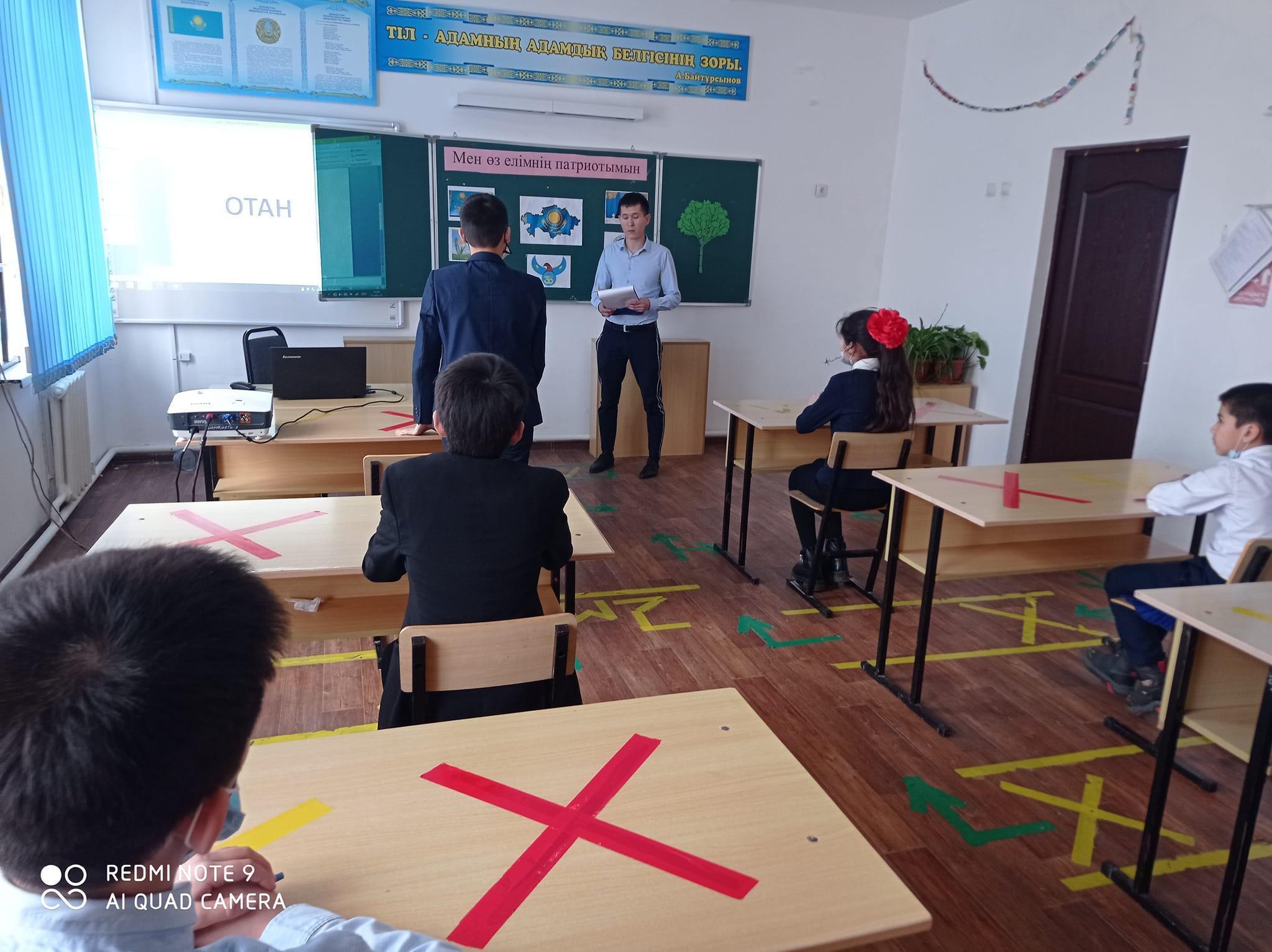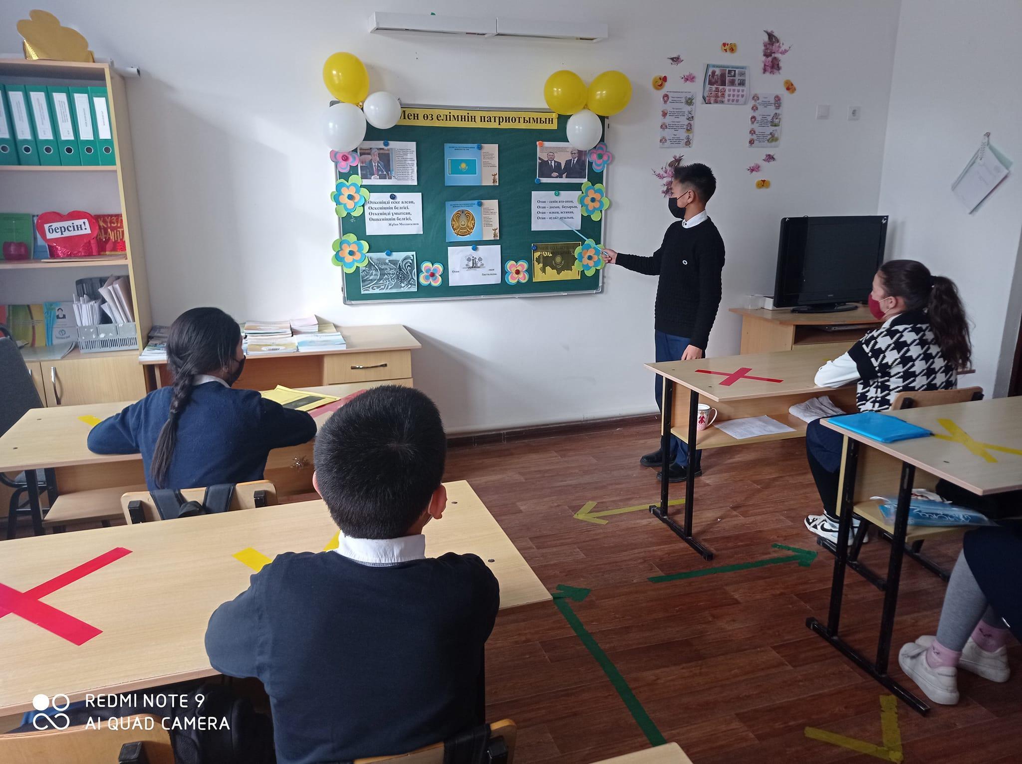 "Қарасу негізгі орта мектебі, мектепке дейінгі шағын орталығымен" отдела образования Кербулакского районанде 8 сынып оқушылары "Мен өз елімнің патриотымын" тақырыбында тәрбие сағатын өткізді.Мақсаты: Оқушыларды елін сүюге, құрметтеп қастерлеуге, өз елінің тарихын білуге, туған еліне, жеріне деген сүйіспеншіліктерін арттыру.Оқушыларды ұлтжандылыққа, атамекенін көздің қарашығындай сақтай білуге,патриоттық сезімге тәрбиелеу.Сынып жетекшісі-Байгожин Р.А.