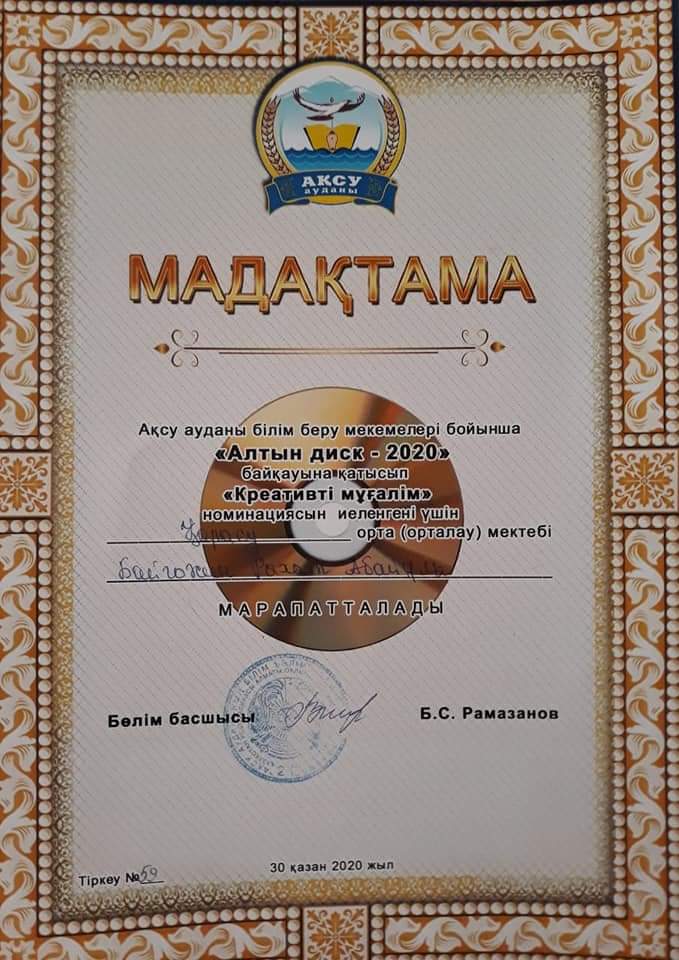 10 ноябрь 2020 0 1 2 3 4 5 "Алтын диск" аудандық байқау 2020-2021 оқу жылында информатика пәні мұғалімдер арасында өткен "Алтын диск" атты аудандық байқауына Қарасу негізгі орта мектебінен Байгожин Рахат Абайұлы қатысып, "Креативті мұғалім" номинациясымен марапатталды